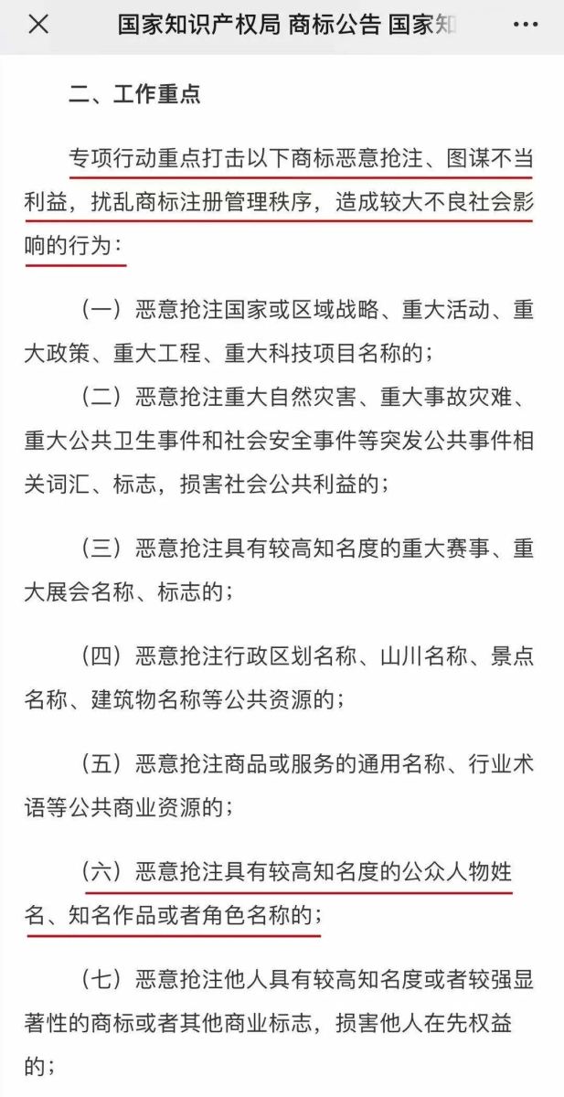 今年3月24日,国家知识产权局印发了《打击商标恶意抢注行为专项行动方案》的通知(下称《通知》)。《通知》强调,商标恶意抢注行为严重损害诚信经营市场主体和社会公众的合法权益,严重危害商标注册秩序。为强化源头治理,建立形成部门协同、统筹推进打击商标恶意抢注行为的高效工作机制,国家知识产权局决定自2021年3月起,集中开展打击商标恶意抢注行为专项行动,严厉打击7类图谋不当利益、扰乱商标注册管理秩序、造成较大不良社会影响的恶意抢注情形,其中一类即为“恶意抢注具有较高知名度的公众人物姓名、知名作品或者角色名称的”。